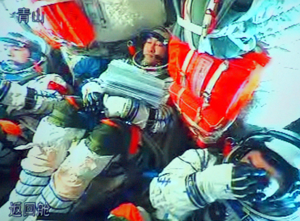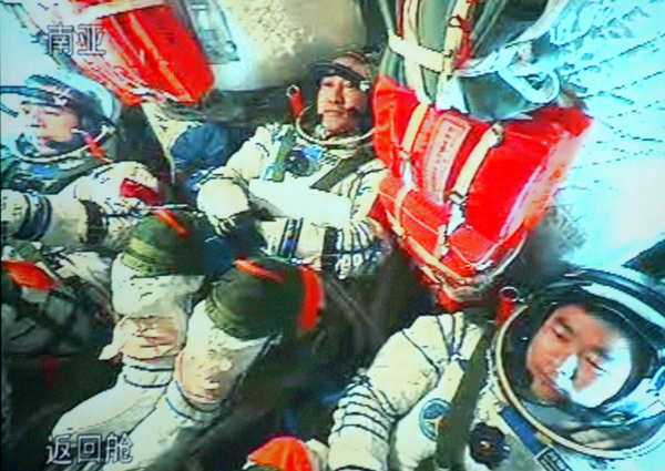 北京飞控中心指挥大厅大屏幕显示,北京时间9月28日下午15时30分许,神舟七号飞船返回舱正在做环绕地球第45圈的旅行,三名航天员即将返回地球,此刻他们已经穿好舱内航天服,神态安详平静。 李非摄
