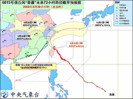 今年第15号超强台风“蔷薇”的中心已于今天下午3时40分在我国台湾省宜兰县南澳附近沿海登陆,登陆时中心附近最大风力有16级(51米/秒),下午5时“蔷薇”减弱为强台风,其中心位于台湾省宜兰县境内,就是北纬24.5度,东经121.5度,中心附近最大风力有15级(48米/秒)。