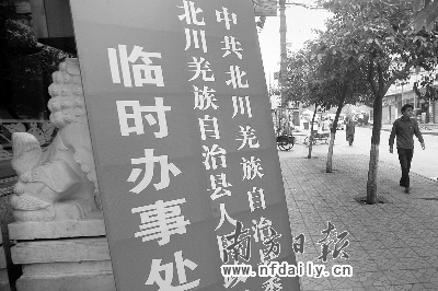 由于北川新县城选址一直待定,北川县委、县政府的驻地在灾后数易其址。从最初北川中学附近的帐篷,迁至北川擂鼓镇的帐篷。期间,还曾在安昌镇天龙宾馆的大堂设立临时办事处。县里的各委、办、局则挤在旁边的一间火锅店里,甚至“三个单位合用一个桌子”。后来化整为零。县级61个单位分散租用安昌镇的民房作为办公地兼集体宿舍。