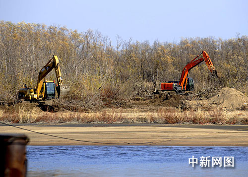 十四日晚间,黑瞎子岛的江面上起了小雾,不过在抚远县通江口仍可以看到对岸的黑瞎子岛,当时正有一批中方人员在黑瞎子岛上新的边界线附近进行施工,直到晚上五时许,这些人员才乘船离开。目前中方正在积极铺设通往黑瞎子岛的浮桥,而一批大型机械已在十四日登岛,开始修路。