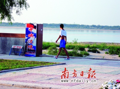 一个孩子走过“中俄边境”的牌子,他对面是黑瞎子岛。