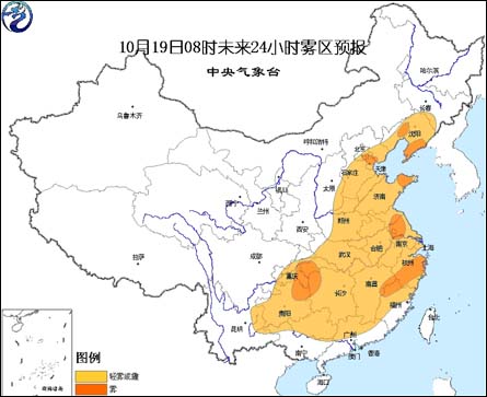 中新网10月19日电 据中国气象局网站消息,中央气象台10月19日6时继续发布大雾预报: