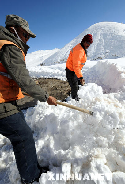 10月30日,西藏错那县养护段三工区的养路工人在清理公路积雪。新华社记者贾立君摄