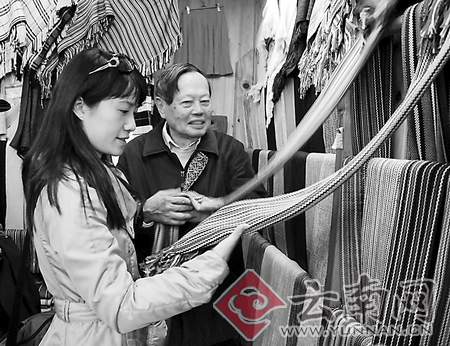 下午5时多,杨振宁和翁帆一行来到丽江古城木府附近“天雨流芳”古牌坊下,突然又转头往回走。原来,一家民族服饰小店吸引了他。这家店主营手工编织的民族围巾,身着民族服装的小姑娘一边还在用手工编织着这些产品。杨振宁拉着围巾摸了又摸,看了又看,将围巾搭到翁帆的脖子上试了又试。