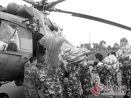昨日下午,3架从成都军区起飞的军用直升机在昆明巫家坝机场补给汽油之后飞抵楚雄。据了解,这几架曾参加过汶川地震救援的飞机将把大米、帐篷、棉被等灾区急需的物资运抵无法通路的楚雄市西舍路乡和双柏县鄂嘉镇茶叶村委会。
