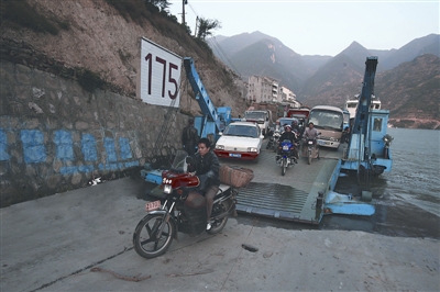 昨日,秭归县香溪渡口,摩托和汽车从汽渡上开出,经过175米水位线。