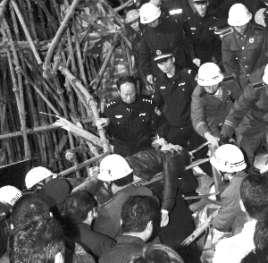 时间就是生命,救援人员有的用铁锹铲土,有的用手撕开挂在脚手架上的巨型沙袋,将袋中的沙土往外转移。终于,到晚上9点10分左右,最后一名民工从土堆中被救了出来,此时距事故发生已近4个小时。这名民工已经一动也不动,浑身冰冷,很快被抬上急救车送往医院。