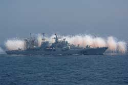 “和平使命-2005”中俄联合演习在黄海举行,我导弹驱逐舰发射干扰弹。
