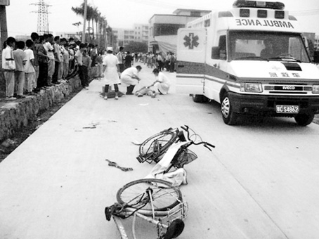 而此时,骆某正驾驶着泥头车(当地拉渣土的一种货车)经城东歧江路开往城东中学,在歧江路的拐弯处撞倒了3名学生和1名群众。正在城东中学北门(后门)值班的综治员黄积强和张耀毫发现后,一人边大喊让刚放学的学生们躲避,边用对讲机向白蕉镇派出所报告,另一人则追赶泥头车喝令其停下。