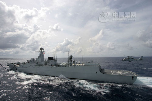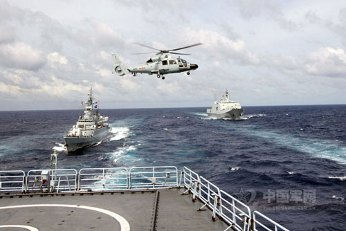 海上战舰驰骋,空中战鹰盘旋。11月上旬,南海舰队组织支援舰、登陆舰、驱逐舰、护卫舰、舰载直升机,首次在南沙附近海域开展了一次综合作战支援演练。他们在成功组织“两横一纵”海上补给训练的同时,演练了舰载直升机起降、悬停、侦察、模拟救援等课目,使舰机协同能力有了新的提高。(中国军网发 饶燕文摄)