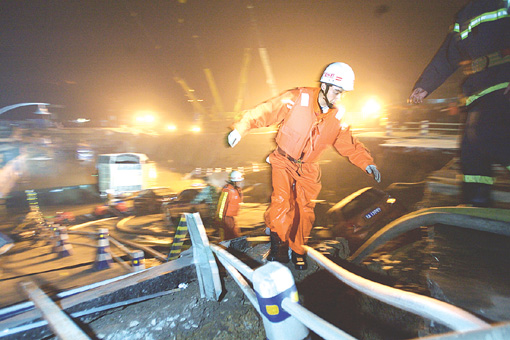 “马路突然下陷,路面倾斜成了六七十度的坡。我把握不住方向,摩托车直接撞上了路边的隔离墩。我感觉整个大地都在震动,周围的塔吊也都倾倒了。”金国飞说,当时他完全懵了,“我第一反应就是拿出对讲机向队里汇报情况。”汇报完情况,金国飞赶紧往路面上爬,然后在现场参与了一夜的救援。