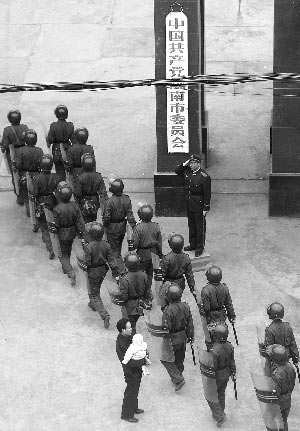 不法分子在前院纵火焚烧了市委保安室和信访接待室,以及停放在前院的摩托车、自行车和砸坏的办公用品,并将前来救火的一辆消防车强行抢夺开进大院,后被制止。之后,武警战士和公安民警将聚集人员清理和疏散出市委大门,凌晨4时左右,事态暂时得到控制。