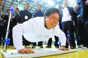 11月21日,一名公务员正在参加俯卧撑测试。当日,浙江省第二届公务员体能测试比赛在杭州西湖体育馆举行,300余名公务员参加了肺活量、俯卧撑、坐位体前屈、绕杆跑等项目的测试。