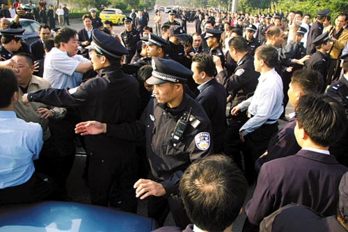 昨天上午,大批警察处置的哥围聚事件 本报记者 林桂炎 摄