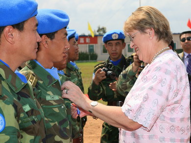 洛伊女士热情赞扬了中国对联合国维和事业的支持。她说,自2004年3月第一支部队抵利以来,中国维和部队为利和平进程和人民生活改善做出了重大贡献。这充分显示了中国政府和人民对联合国在利维和行动的支持,积极帮助利实现和平、安全、复兴与发展。她高度赞赏中国维和部队的出色表现,称赞中国三支维和分队的领导“指挥有方”,中国军队是“中国的骄傲”。她还对中国工兵分队在任务期即将结束之际仍愉快受领任务,修建连接利东南两州首府要道上的桥梁表示感谢,相信他们一定能出色完成任务,造福于利人民。洛伊最后勉励维和官兵为了实现和巩固世界和平与安全而继续努力。