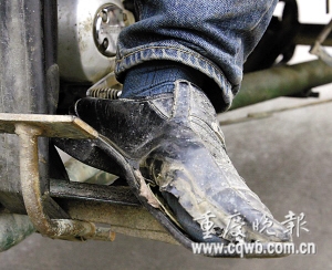 一路的奔波使得皮鞋破旧不堪 记者 钱波 摄
