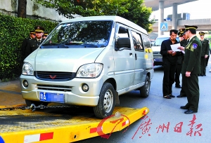 执法人员昨日对一辆查获的非法营运车辆依法进行处理。 记者王燕摄