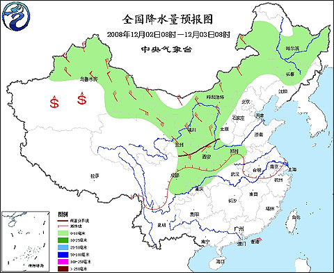 2008年12月2日8时—12月3日8时全国降水量预报图