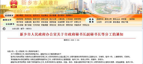 记者随后登陆新乡市人民政府门户网站,在市政府文件一栏,发现了该市2008年10月通过的《新乡市人民政府关于市长副市长市长助理等分工的通知》和《新乡市人民政府办公室关于市政府秘书长副秘书长等分工的通知》两个文件,文件表明,河南省新乡市设有11名副市长;1名秘书长,16名副秘书长;此外还有6名调研员协助副市长工作。 (荆楚网)