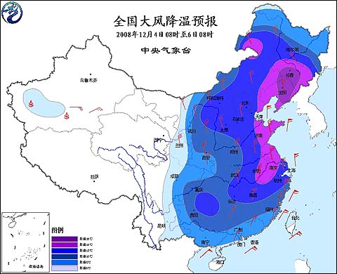 中央气象台2008年12月4日06时继续发布寒潮橙色警报: