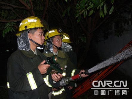 根据现场情况,中队指挥员立即向支队“119”调度指挥中心请求增援,并果断下达作战命令,一台消防车停靠在制冷车间的围墙外,铺设水带出两支水枪向制冷车间射水控制火势,另一台消防驶入厂区大门口内部,停靠在南北角,消防官兵身穿防化服,佩戴空气器在工厂技术人员的带领下深入制冷车间门口进行灭火和稀释泄漏的氨气。另两台消防车负责供水,并进行现场的疏散和警戒。