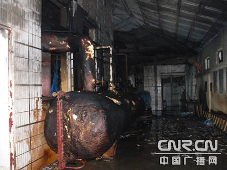 火灾过后,车间内一片狼籍,部分氨气管道外已结冰,在车间,技术人员经过检查,发现的连接氨气的电机制冷机一个盖子“爆了”,技术人员称爆炸就是从这里产生的。