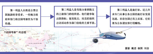 第三利益人自然就是旅行社。据了解,近几年来专门从事公务出国的旅行社发展迅速,目前全国已有上百家,集中在广州、上海、北京、南京、宁波等地。它们靠为公务团安排行程赚钱。“现在各级各地组织的出境、出国考察活动,绝大部分是通过旅游公司出去、并由境外旅游机构接团安排行程的,其实就是公款旅游。”新余市委一位干部对记者说。