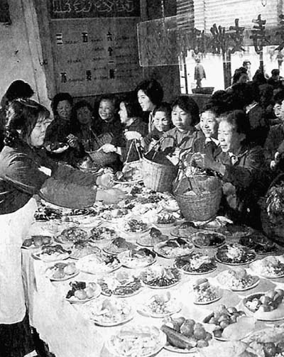 赶到吃午饭,情况更紧张。崇内大街的崇明饭馆,只供应四川“担担面”。这个饭馆的营业面积只有三十几平方米,六张饭桌三十个座位,一顿午饭要接待五百多顾客,每个座位先后要坐十七个人。人们等不及,只好站着吃,有的干脆端着碗到门外街上吃。在一些卖炒菜的饭馆吃一顿饭,要用一个多小时。北京还有一些卖特别风味饮食的饭馆,因为太拥挤了,就实行提前“挂号”。中午吃饭,早晨排队领“号”,晚上吃饭,中午排队领“号”。