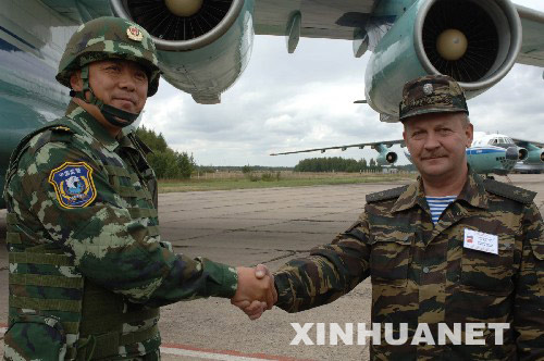 9月1日,在俄罗斯首都莫斯科的奇卡洛夫机场,俄罗斯内务部内卫部队副参谋长谢尔盖·库佐夫(右)欢迎率领中方参演部队的演习联合战役司令部参谋长徐平。