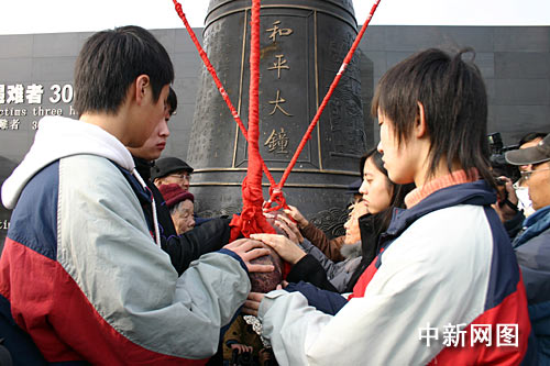 南京大屠杀幸存者、青少年代表撞响和平大钟。