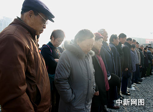冬日的南京显得阴冷。早上十时,警报声中,聚集在纪念馆悼念广场的三千军民低首默哀三分钟,并向遇难同胞三鞠躬。