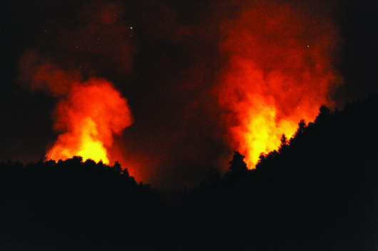 昨日凌晨1时,记者连夜赶到三口乡华湘村时,远远就看见山上火光冲天。