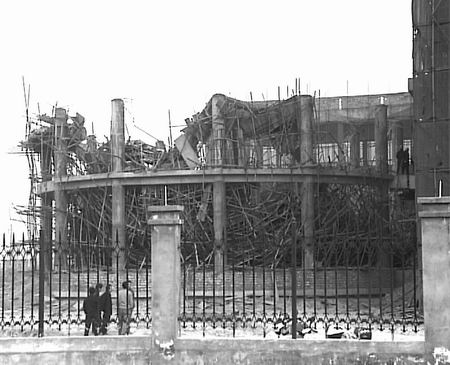 据了解,事故发生在当日下午1时30分许,10多名工人开始浇筑娲城迎宾馆门楼,不久,正在浇筑的二楼楼顶突然坍塌(如图),施工人员被埋在下面。一名负责开振动棒的受伤施工人员说,当时有十几个人在平台上作业,振动棒响起来后,他和几个人突然从工作平台上掉了下去。其中,一名姓李的民工头部受伤,送往医院后直接住进了重症监护室。