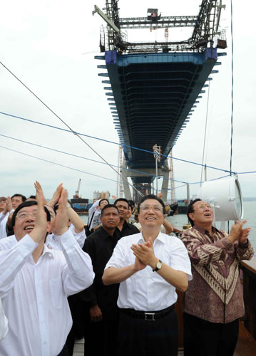 李克强说,中国在一些重大基础设施方面具有明显的国际市场竞争优势。他要求有关部门从财政、金融信贷等方面对企业给予支持。李克强向正在桥上施工的中方工程技术人员和工人挥手致意,勉励他们保证质量,注意安全,高标准地完成建设任务,不负祖国的托付,把大桥建成中国和印尼人民之间的友谊之桥。