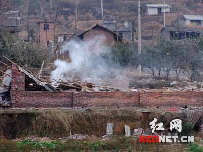 冷水江市岩口镇农科村一鞭炮厂仓库被炸为废墟。