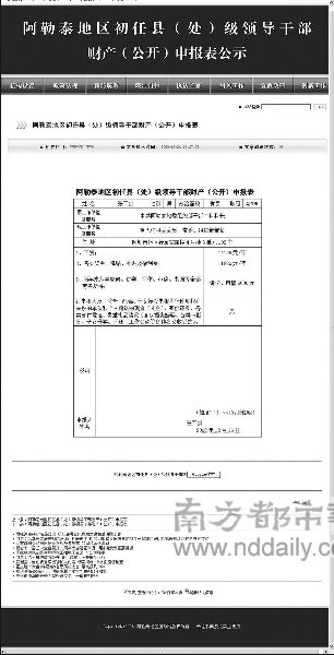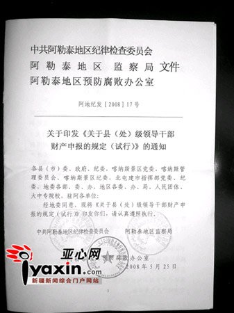 新年第一天,新疆阿勒泰地区的廉政网上,首批公布了55名新提拔正科和副县级干部的财产申报资料。同一天,该地区启动了县(处)级领导干部的首次财产申报工作。