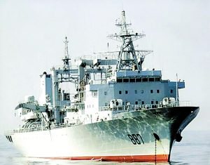 “微山湖”号综合补给舰,是我国自行设计建造的大型补给舰,排水量近3万吨,可同时对3艘舰艇和1架直升机进行补给,可自行携带1架直升机。该舰先后圆满完成出访巴基斯坦、印度、泰国、俄罗斯、英国、西班牙、法国、日本等舰艇伴随保障任务以及远航训练和联合军演,目前已安全航行近10万海里。