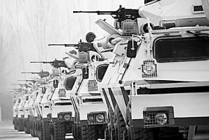 车队启动了。一路上,沿途不断传来枪声和爆炸声,伊拉克警察和美军车队不时从身边疾驰而过。席栓柱和战友们在车内头戴钢盔、身穿防弹衣,手指头一刻也不离开扳机,眼睛全神贯注地搜索着窗外每一个可疑情况。
