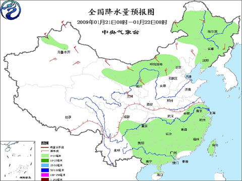 中央气象台2009年1月21日6时发布未来三天天气预报: