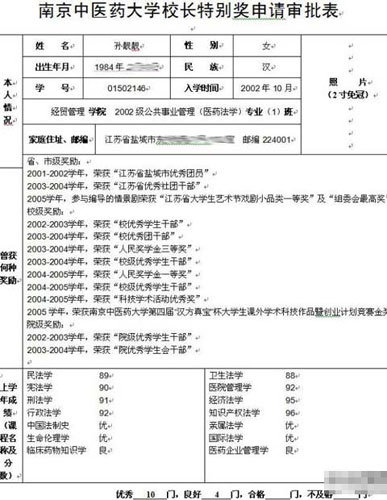 通过网上一份“南京中医药大学校长特别奖申请审批表”里可以看出,孙靓靓是一个各方面都很出色的学生。她从2002年起每个学年都是校级或院级的优秀学生干部。大学期间品德方面、学习方面、实践方面等方面的都很优秀。依据这份申请表,孙靓靓是个积极参与社会活动,同时也是个学习、生活等都很踏实的人,因此时常拿到奖学金,还参与编导及演出的该校首部校园DV电影《那一年的青涩》很受好评。