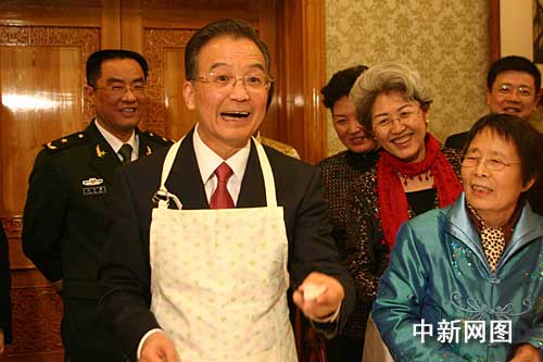 当地时间二月一日中午,正在英国访问的中国总理温家宝来到中国驻英大使馆看望外交人员和华侨华人。他和大家一起包饺子,还风趣地说自己包饺子的手艺很不错。中新社记者 张朔摄