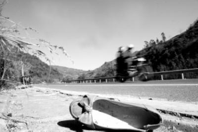 车祸发生的路段是没有隔离栏的双向两车道路面,去年刚刚通车的路面情况较好。发生车祸的地方,只是一个不太急的弯道。虽然车祸已经过去了10天,但通过车祸现场周围散落的摩托车碎片、死者的衣物、血迹,仍让人感觉到车祸发生时的惨烈情景。