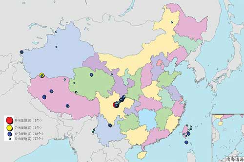 中新网2月4日电 国家地震局网站日前发布2008年中国5级以上地震目录,2008年,全国共发生就5级以上地震97起,大部分集中在中西部地区。其中5-6级地震77个,6-7级地震18个,7-8级地震1个,8-9级地震1个。
