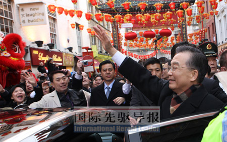 在每个地方,温总理都在不停地讲话,对政府首脑,对商界领袖,对华人华侨。一到伦敦,他第一时间去到唐人街,拿着麦克风,站在高台上,面对两千多人信心喊话。事后他说:“这次虽然是春节期间出访,但是面对唐人街的那些中国同胞,一切都值得了。”