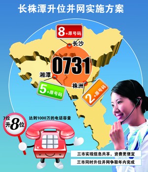 1月19日,国家工业和信息化部同意启动长沙、株洲、湘潭本地电话网升位并网调整方案制定和论证工作,长、株、潭三市固定电话网如何由7位升为8位?日前,中国电信湖南公司副总经理刘少阳向媒体介绍了详细内容。他介绍,国家的批文下达后,中国电信湖南公司向湖南省通信管理局提交了“长株潭升位并网实施方案”,该方案中编号方案确定为长沙市在原电话号码前加“8”,株洲加“2”,湘潭加“5”,这样三市的固定电话号码将从原来的7位升为8位。