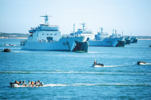 “按新大纲施训,联合是个重头戏。但是,以往高层指挥机构联训较多,基层部队联训不够。这种做法,容易造成联合训练‘有想法没办法’,使得基层部队联训就像捆篱笆,拴在一起也是貌合神离,经不起风雨。今年按纲施训,我们力求解决这个问题,大力提高一线指战员的联合素质。”王支队长话音刚落,只见荧屏上出现精彩一幕:登陆舰抵达泛水点,帆缆业务长、四级士官罗晓春组织帆缆兵开大门、展吊桥,指挥两栖坦克泛水;当登陆兵突击登陆时,遭到“敌”滩头火力猛烈阻击,“海洋山”舰舰长邓先武果断命令舰炮进行火力支援,发发炮弹将“敌”地堡掀上半空……