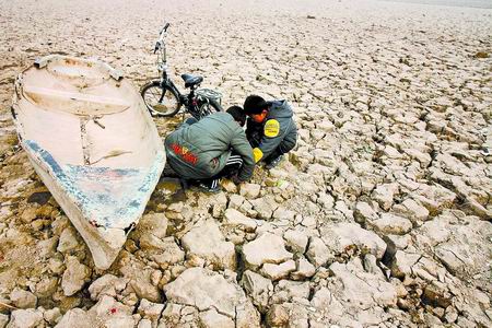 昨天上午11时许,记者在西流湖北湖看到,偌大的湖面寻不见水的踪迹,已干涸的湖底到处出现深约50厘米、宽近10厘米的裂缝。缝隙中间,留有许多死去的螺蛳、河蚌,几个孩子争相在龟裂的湖底上捡拾。而来自北陈伍寨村的刘大爷等人,目睹这一幕却是忧心忡忡。他们说,在湖边生活了几十年,这是头一次看到西流湖干涸,“旱情太厉害了,湖中生物都死了,不知多少年才能恢复过来!”