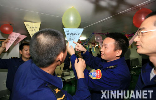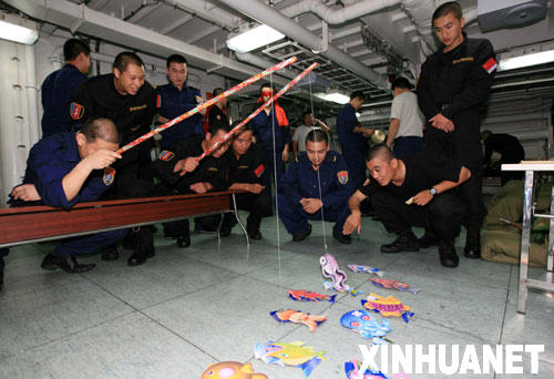 这天晚上是农历新年后的第一个月圆之夜,人们往往视元宵为新春佳节的最后一天。为丰富大家的文化生活,编队利用护航间隙组织了一场游园活动。地点设在士兵餐厅和两个活动室,项目包括蒙眼敲锣、猜灯谜、钓鱼、吹乒乓球、投飞镖等,奖品是瓜子、花生等水兵喜爱的小食品。
