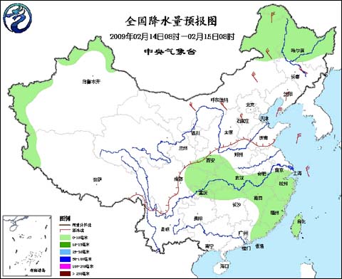 中央气象台2009年2月14日06时发布未来三天天气预报: