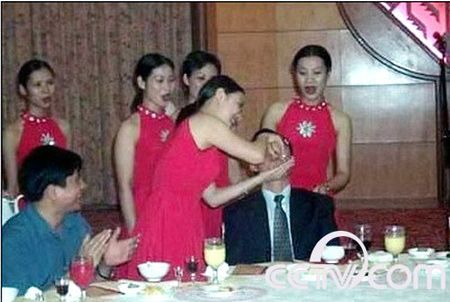 在其上传的一组图片中,虽然招待方设的酒宴依然丰盛,席间各种人物也都频频举杯,但没有酒店的服务小姐作陪敬酒。从图片上可以看到,为了表示对客人的尊敬,招待方只是请了几名身穿少数民族服饰的当地女子,站在客人一侧陪同敬酒。